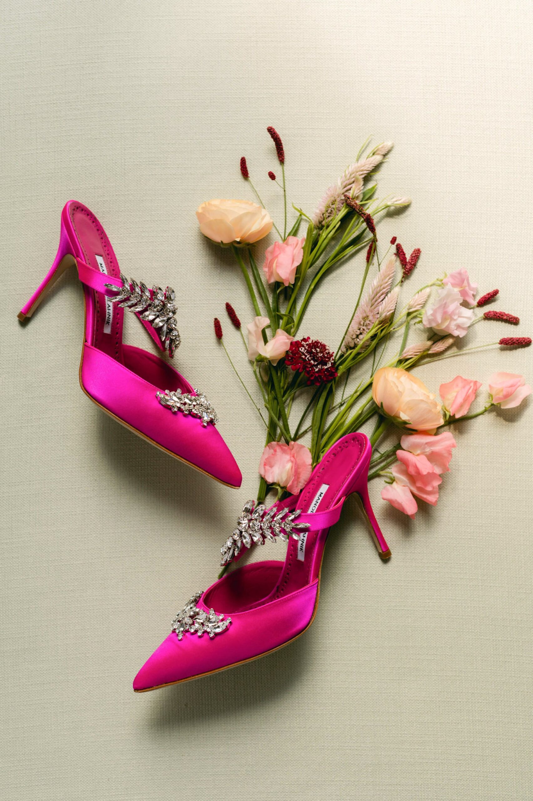 Now let’s talk about our beautiful bride’s details featured in these photos: Amidst the planning process, one of Sarah’s favorite moments was searching for her perfect wedding dress. After an exciting journey, she found “the one” at the Monique L’Huillier boutique in New York City. The exquisite flowers, arranged by Blush and Bloom, beautifully complemented Sarah’s pink flowered veil and shoes.